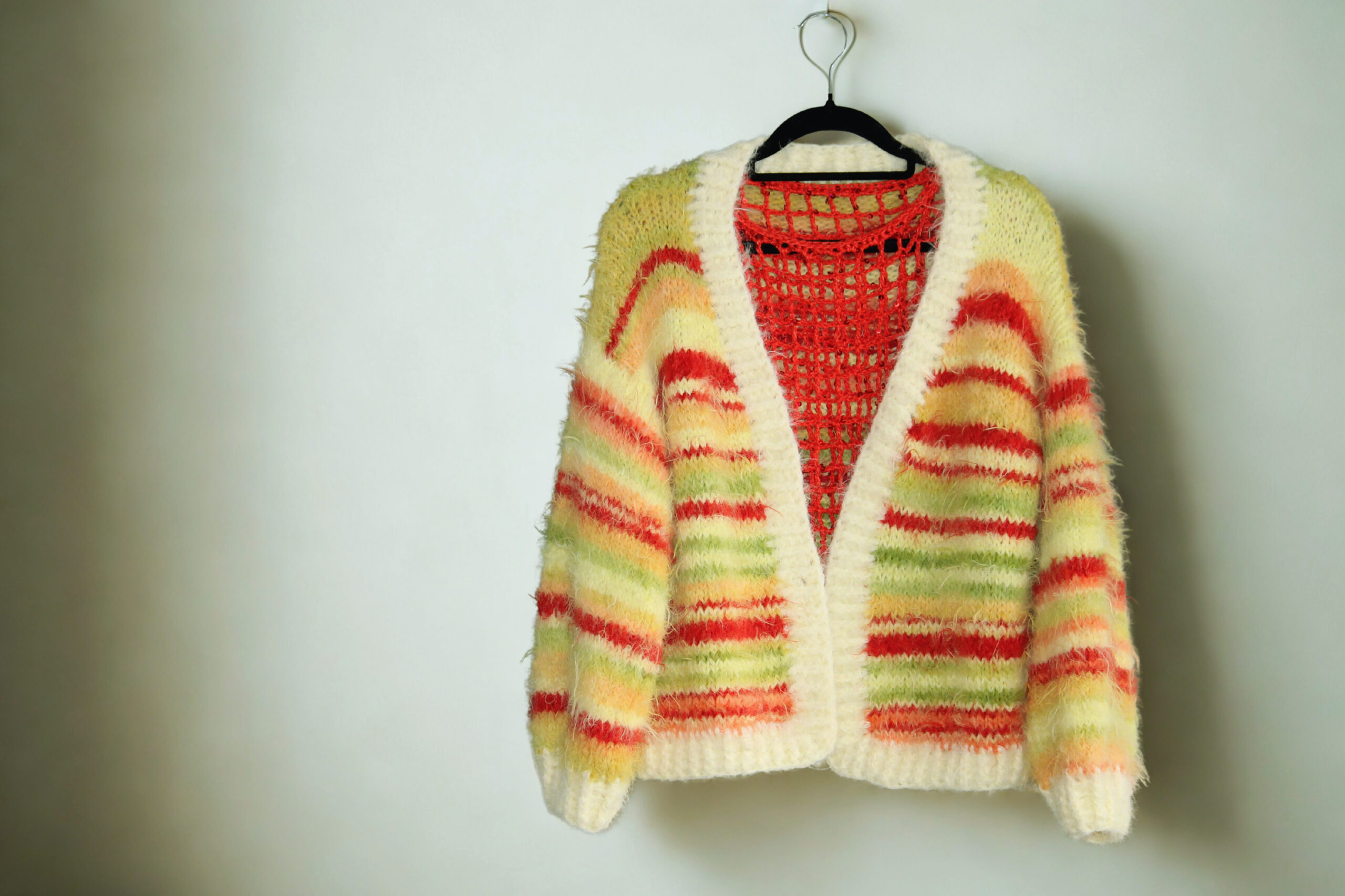 Designet kombinerer varme toner av rød, gul og grønn mot en lys base, og skaper et livlig stripemønster som virkelig skiller seg ut. Den åpne fronten og avslappede passformen gjør den enkel å style – både over en enkel topp til hverdags eller som et statement-plagg.