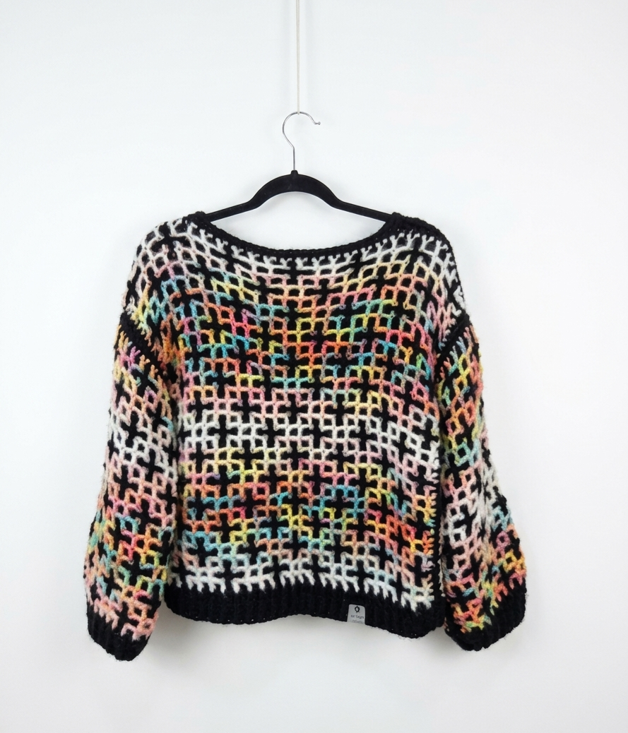 Unik, håndlaget genser fra by yorgA med vendbart design – to uttrykk i ett plagg. Genseren er heklet i Picasso fra Lana Grossa, som gir et spennende fargespill med myke overganger og et levende mønster.