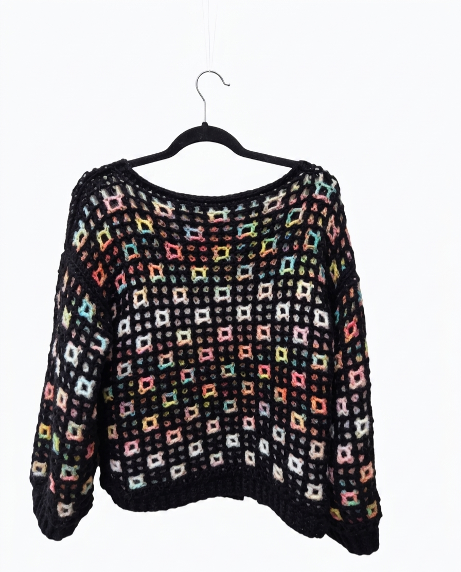 Den ene siden har et lysere, mer grafisk uttrykk, mens den andre siden fremstår mørkere og mer dempet – perfekt for deg som vil variere stilen uten å bytte plagg. Den åpne heklestrukturen gir et lett og luftig preg, samtidig som den gir karakter og dybde.