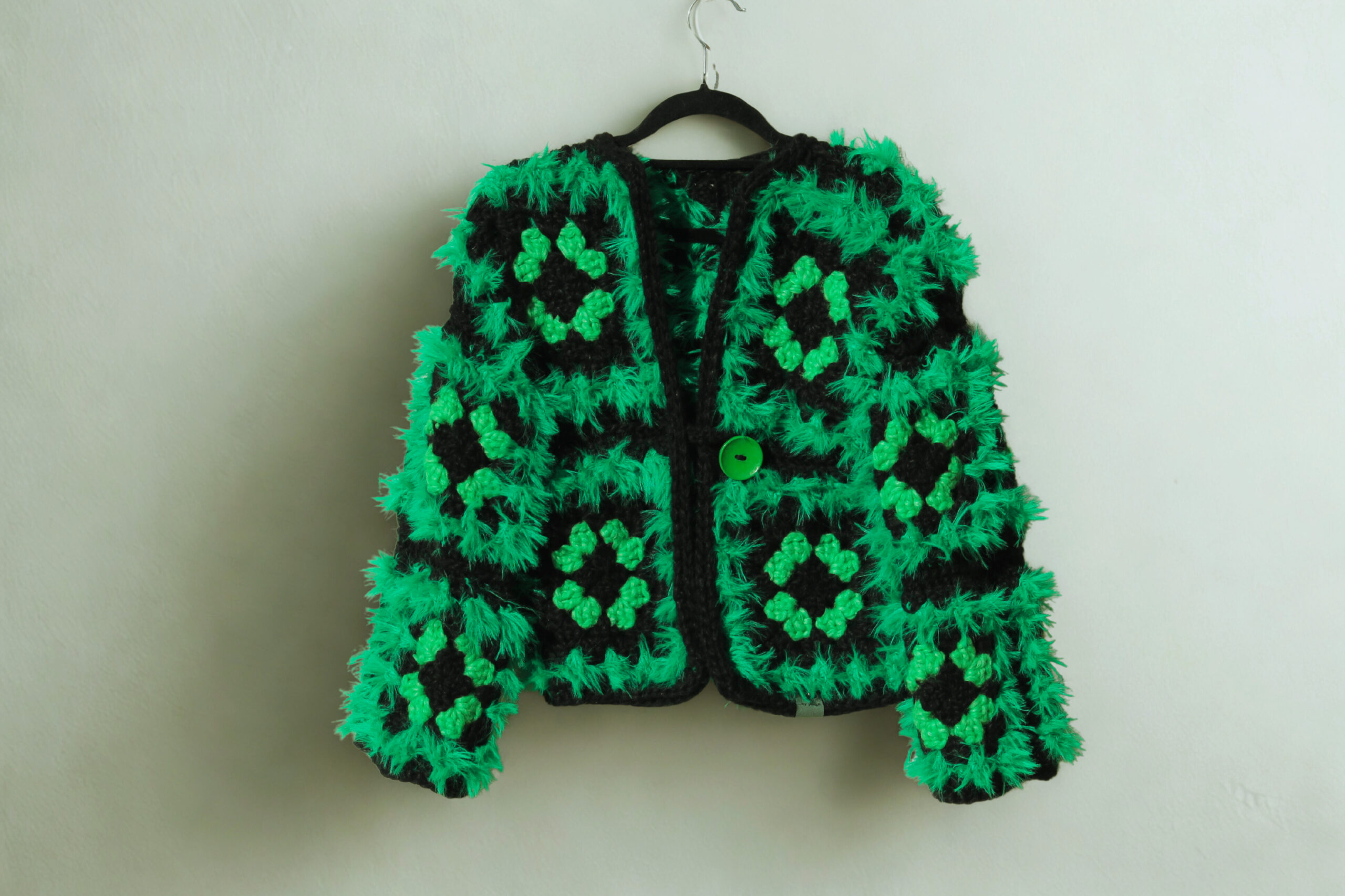 Unik, håndlaget jakke heklet i en luksuriøs kombinasjon av dobbelt Air fra Drops og Piuma. Jakken har et vakkert, grafisk blomstermønster i friskt grønt og sort, som gir et levende og eksklusivt uttrykk.