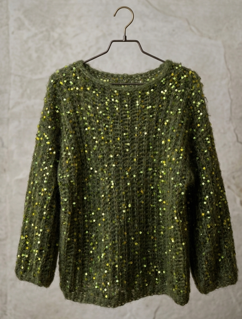 Den dype grønne fargen kombinert med fine paljettdetaljer gir et sofistikert uttrykk som fanger lyset på en vakker måte. Perfekt både til hverdags med jeans eller til en mer pyntet anledning.